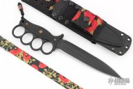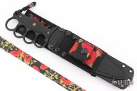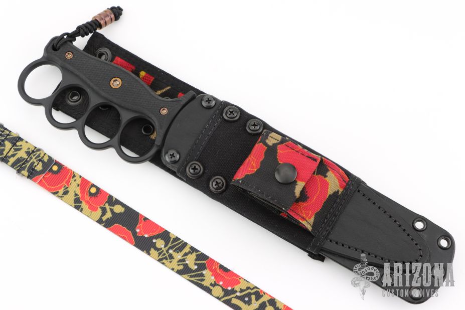 Embodying history and our own design philosophies, the Trench Raider is our rendition of the classic trench knife. We decided to make something that was more true to size vs the behemoth that is Lady Death. The Trench Raiders overall length is 11 3/8" overall length, and has a 7 3/16"" CPM-3V double-edge dagger blade featuring a long fuller down the center. The knuckle duster style handle acts as a guard to protect your hands, and the aggressive outward shape works well for raking. A small detail regarding the knuckles, the style is patterned after the knuckles that President Lincoln's bodyguard carried. The handle is finished with G10 scales with a checkered texture that is suitable in dry or wet conditions. The handles are attached with Grade 5 Titanium fasteners that are electro-anodized in bronze to round out the look. Trench Raider includes a leather and canvas sheath that has a pouch for a lighter mounted on the front. There is also a lighter included, most look like what is pictured, however there are some easter eggs mixed in. The sheath is ambidextrous, and can be worn on a belt or attached to PALS webbing.