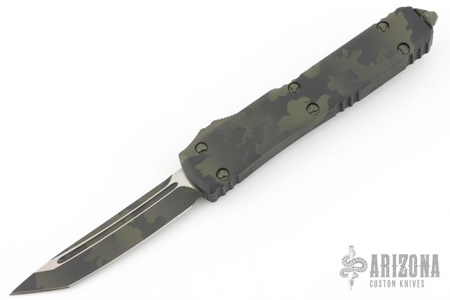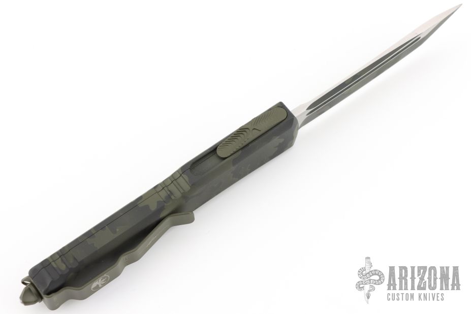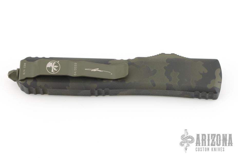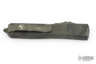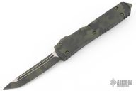 This Ultratech OTF automatic by Microtech features a T/E blade with a standard edge. Stainless steel clip. Glass breaker. OD Green Camo aluminum handle with glass breaker. Dated 04/2022 and serial number 036. Excellent condition. Comes with original box and papers.