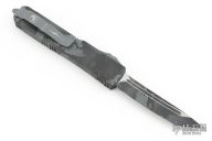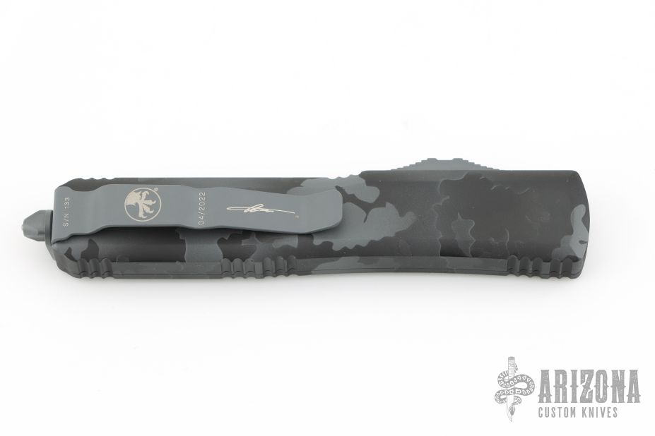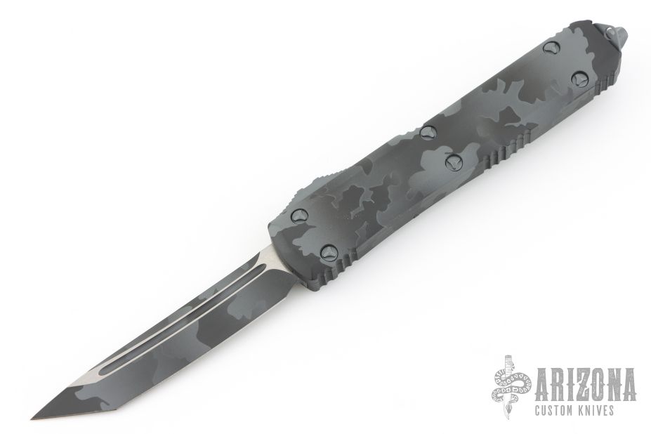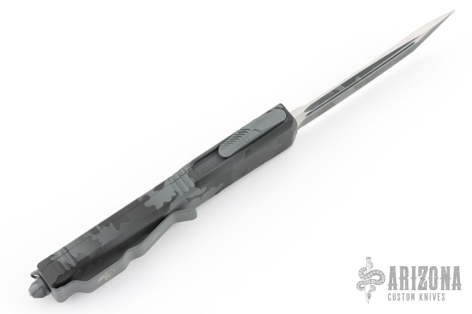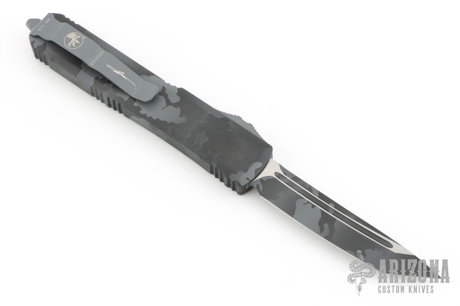 This Ultratech OTF automatic by Microtech features a T/E blade with a standard edge. Stainless steel clip. Glass breaker. Urban Camo aluminum handle with glass breaker. Dated 04/2022 and serial number 133. Excellent condition. Comes with original box and papers.