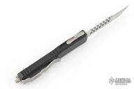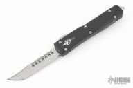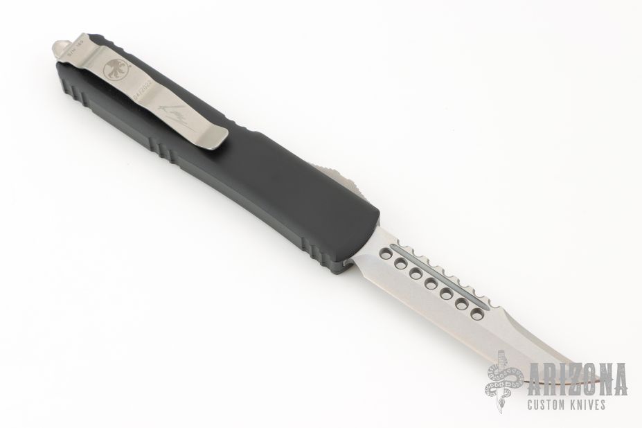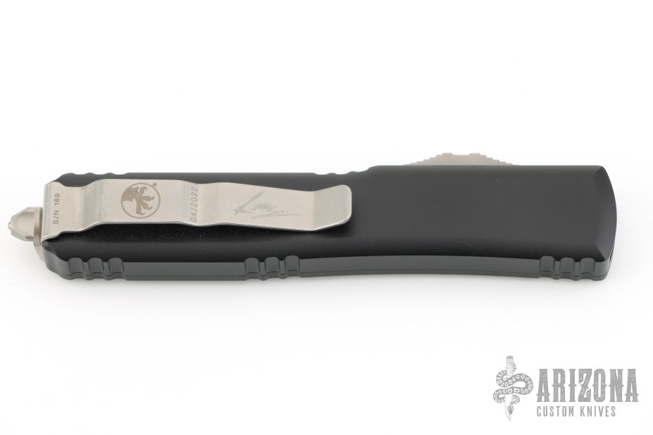 This Ultratech by Microtech Knives features a stonewashed Hellhound blade with satin flats and false top edge. The handle has a black aluminum frame with tip down blasted stainless steel clip and hardware. Comes with original box and papers. 04/2022, S/N 169. Excellent condition.