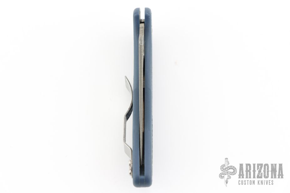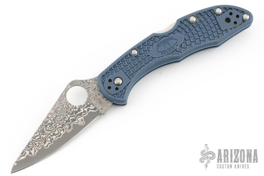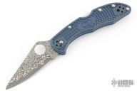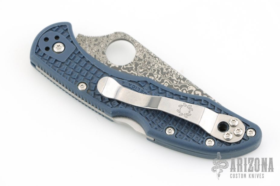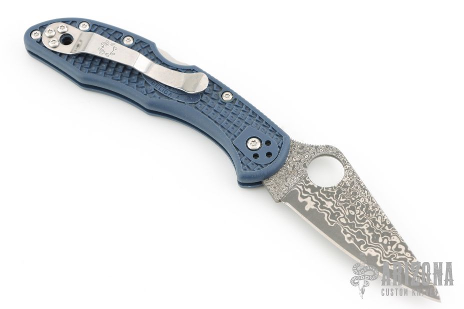 This knife by Spyderco has a Damascus VG-10 Core blade with thumbhole opener and notched thumbrest. The handle has blue FRN scales and a 4-way reversible MXG Deep Carry clip. Comes with original box and papers. Excellent condition.