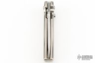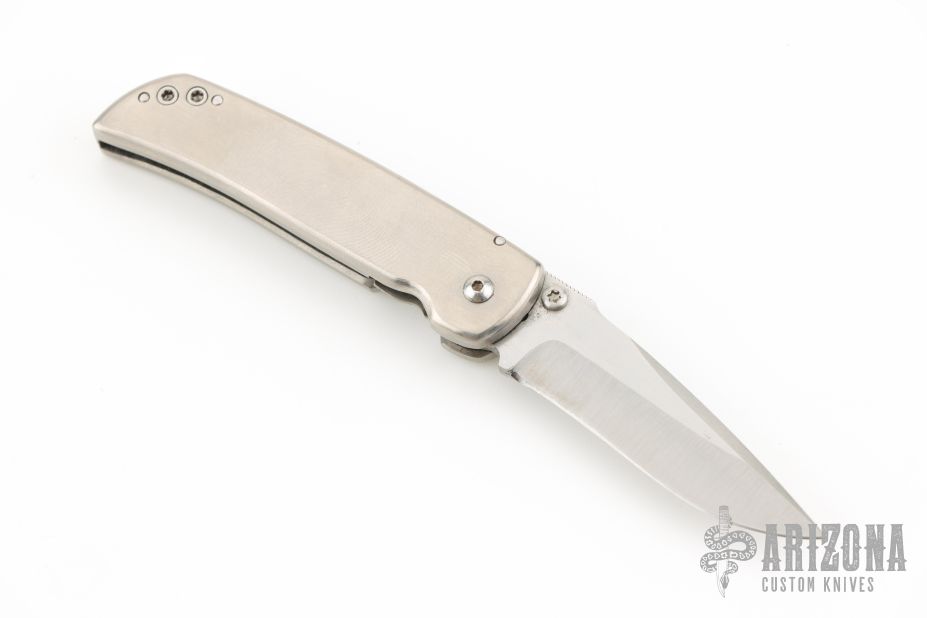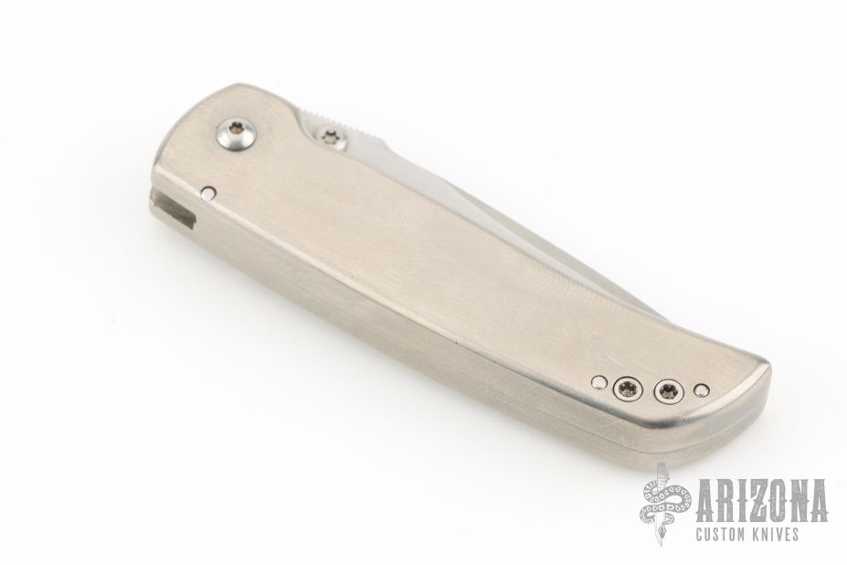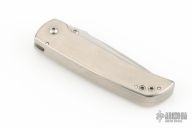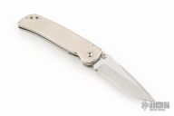 This Mini Spitfire Auto by Larry Chew features a satin finished recurve blade with false top edge, notched thumbrest and dual thumbstuds. The handle has a satin finished titanium frame with a single titanium liner, stainless steel spring. Nice detent, lockup, action and blade seating. Has a few light scratches, some light scuffs, and has some blade play in the open position, otherwise excellent condition.