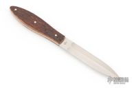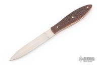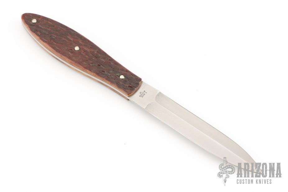 This Boot Dagger by Tony Bose features a hand rub satin finished dagger blade with .095" blade stock and .667" blade depth. The handle has jig amber bone covers over full tang construction. Has a couple light scratches, excellent condition.