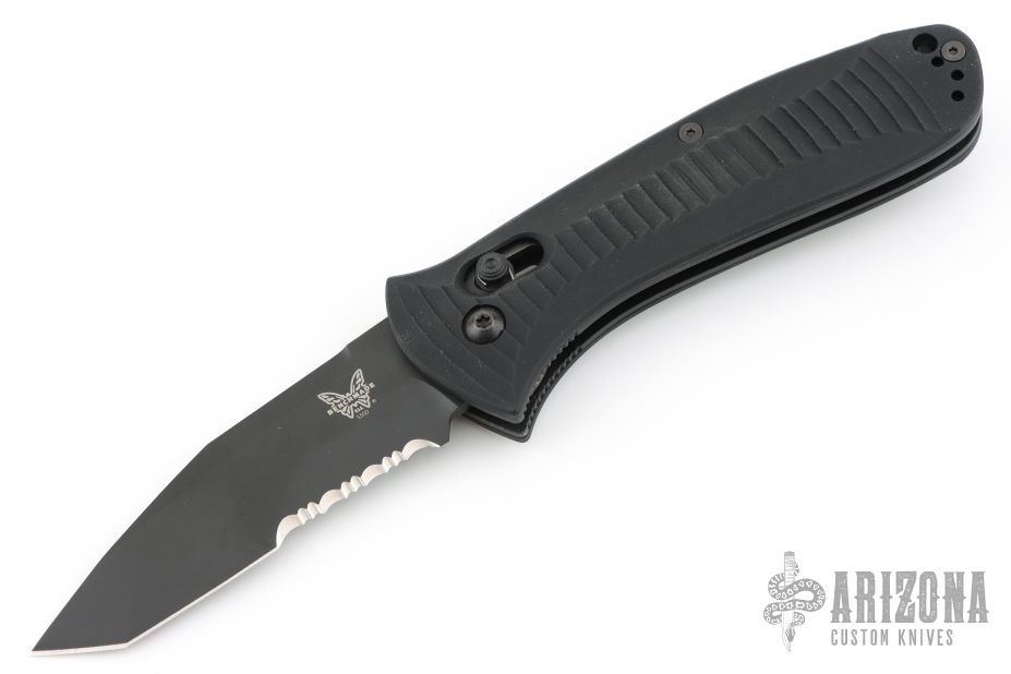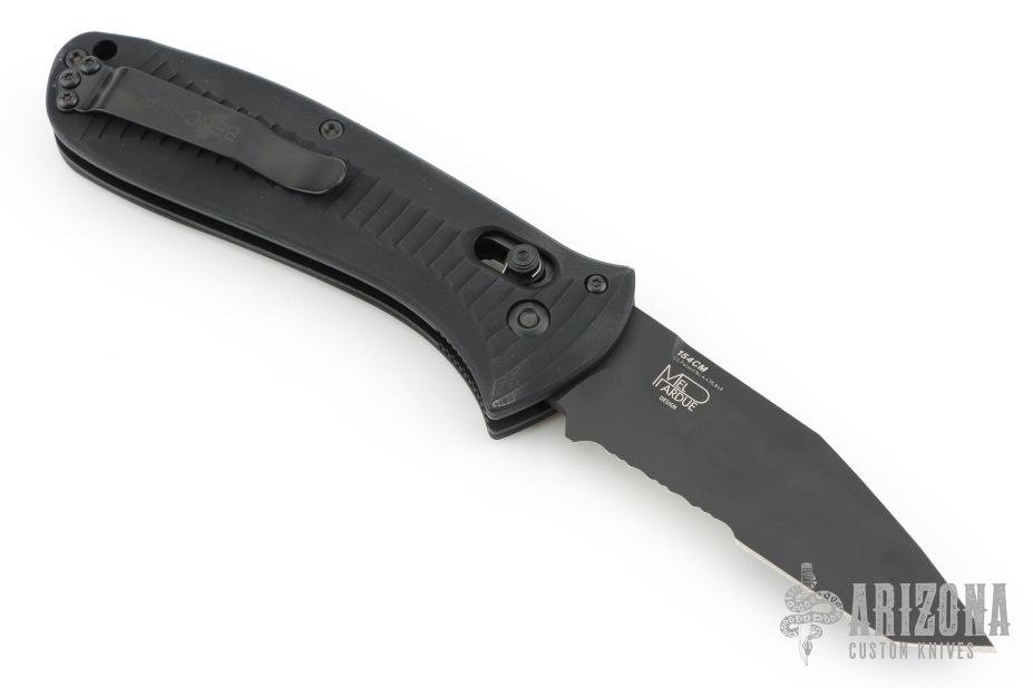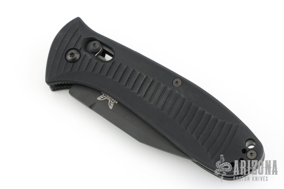 Mel Pardue design. Ambidextrous Auto Axis Pull Button Release - allows for automatic opening with either hand by pulling either Axis button back (buttons on each side of the handle). Integrated spine mount safety. Bi-directional machined handle grip for a superior sure grip. Includes the wrong Benchmade box (5000SBT) and paperwork. Excellent condition.