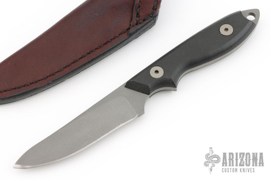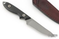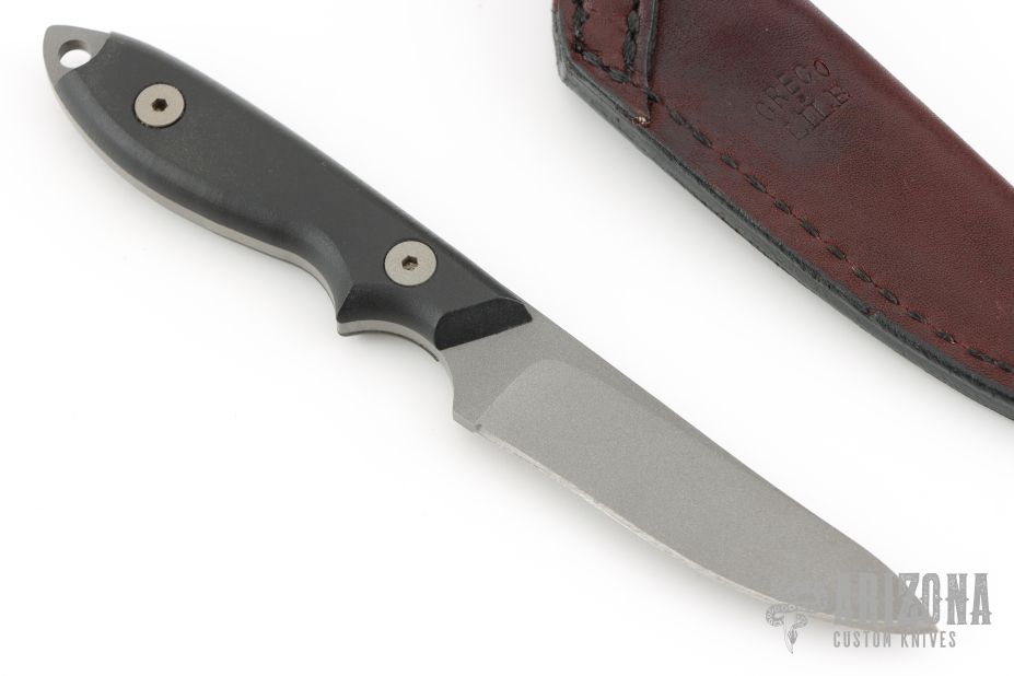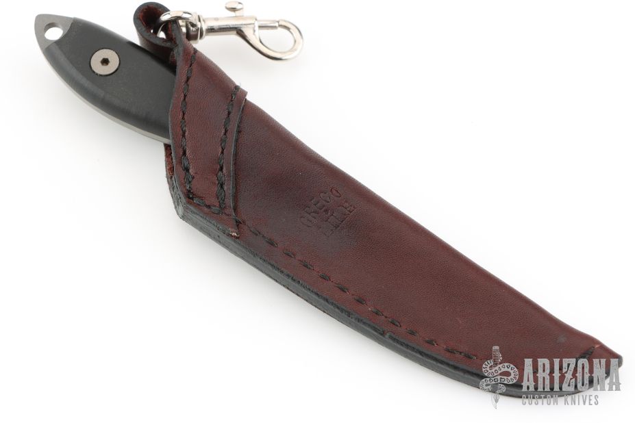 This utility dangler by John Greco features a bead finished blade with .132" blade stock and .888" blade depth, full tang construction. The handle has micarta scales. Includes a black leather sheath with dangler. Has some light scuffs/scratches, has been resharpened. Great condition otherwise.