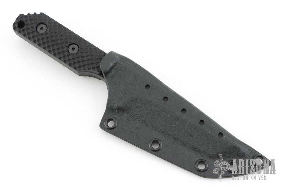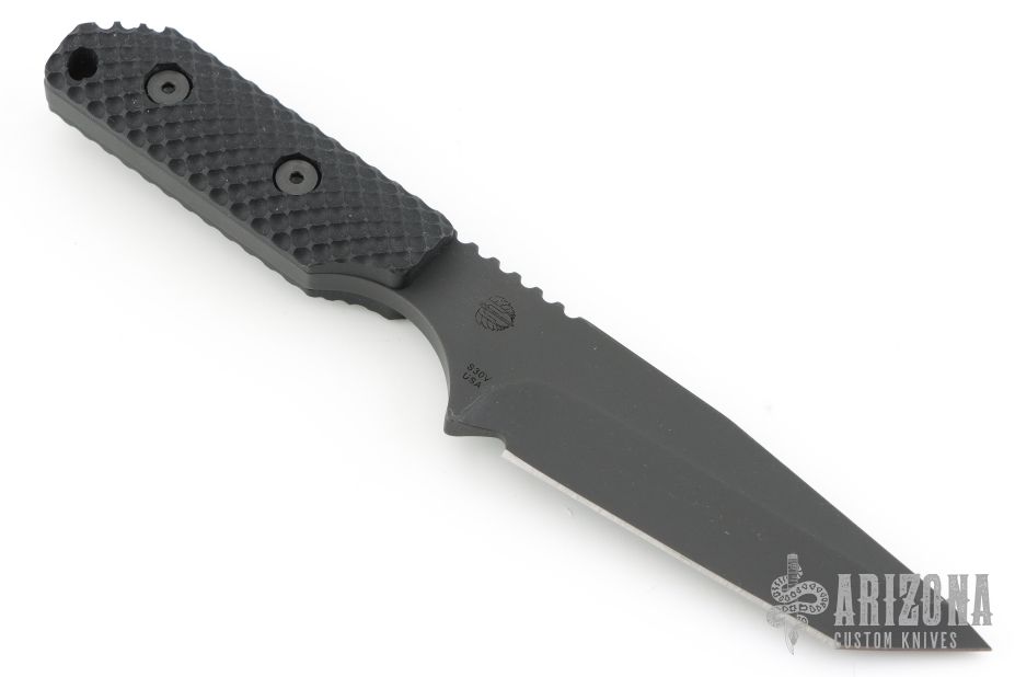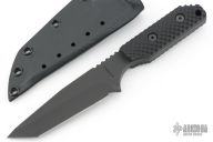 This DB-L from Strider Knives features a clip point tanto style blade with black finish and notched thumbrest, .205" blade stock and 1.306" blade depth, full tang construction. The handle is comprised of black G-10 gunner grip scales. Comes with kydex sheath. Excellent condition.