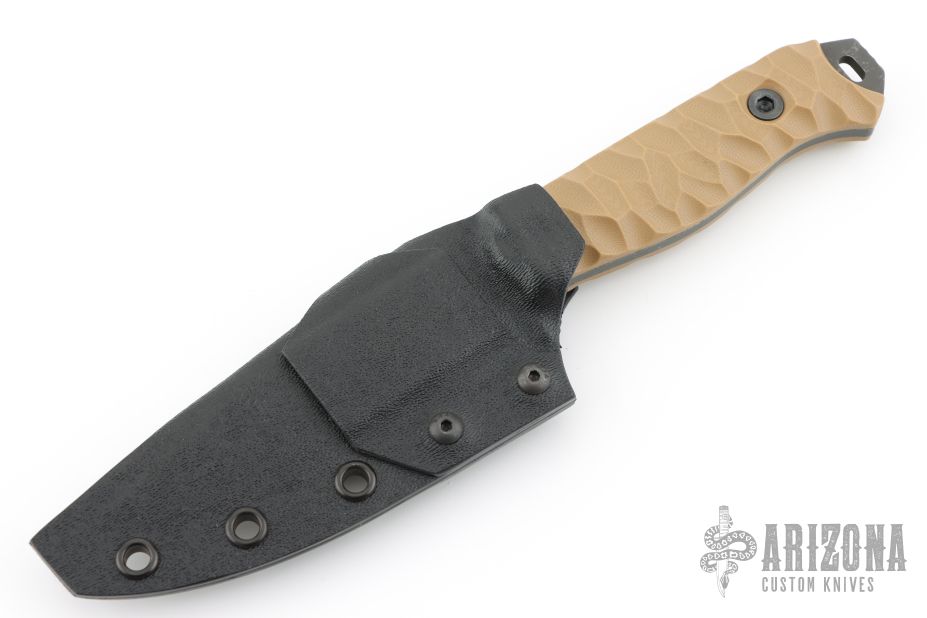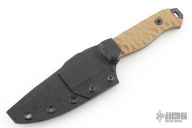 This Field Knife by Half Face Blades features an acid stonewashed blade with a notched thumbrest, .150" blade stock, 1.390" blade depth, full tang construction.  The handle has coyote brown G-10 scales.  Comes with a kydex sheath with clip. Excellent Condition.