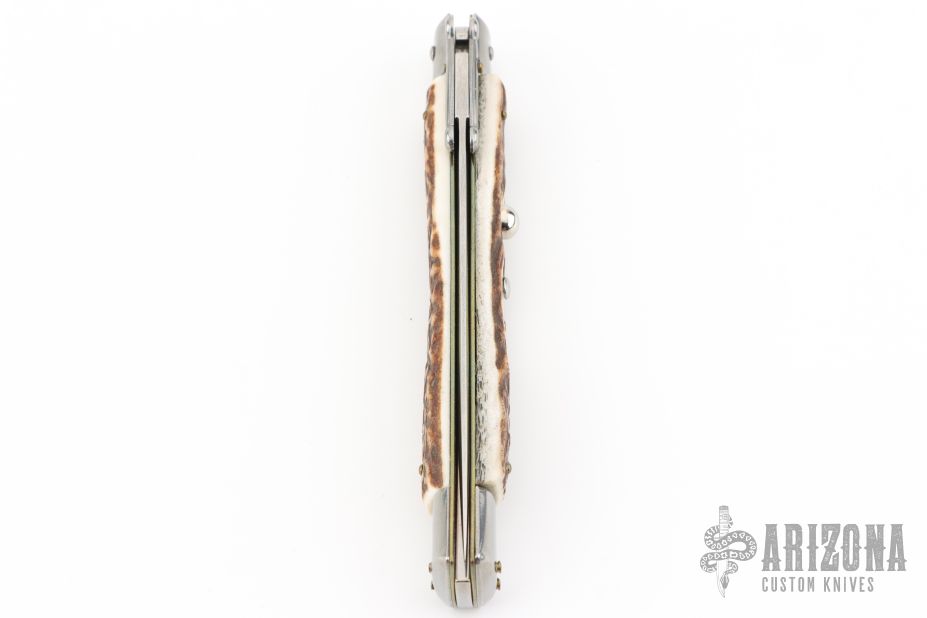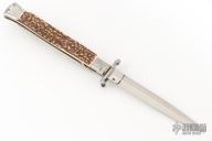 This 11" Swing Guard Auto by Frank Beltrame features a dagger ground blade with false top edge. The handle has stainless steel bolsters, front and rear, stag scales, brass liners, stainless spring. Excellent condition.