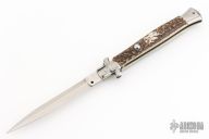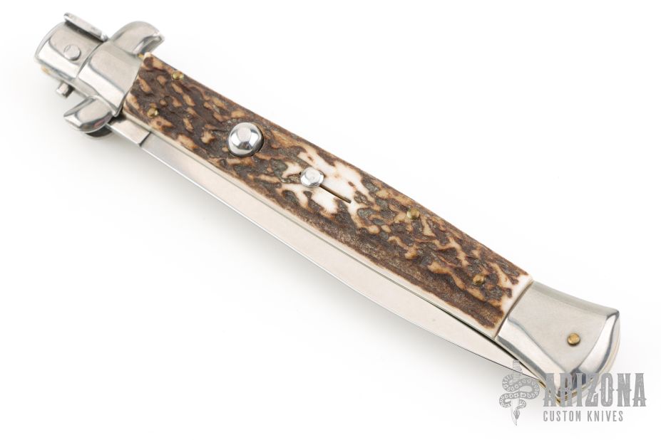 This 11" Swivel Bolster Auto by Frank Beltrame features a tumbled bayonet ground blade with false top edge. The handle has nickel silver bolsters, front and rear, stag scales, brass liners, stainless spring. Excellent condition.