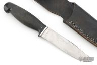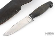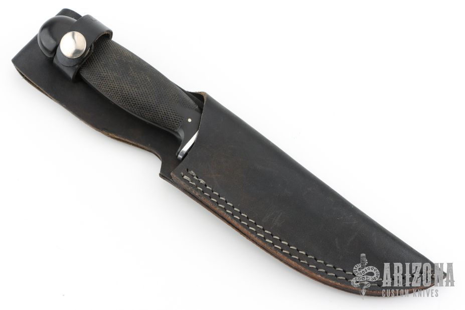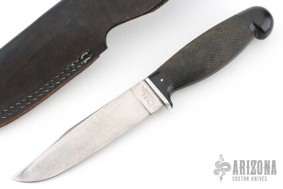 This Vintage Expert Hunter from Case Knives features a satin finished blade with false top edge, .106" blade stock and 1.077" blade depth, full tang construction. The handle has an aluminum guard and a black checkered grip. Includes a black leather sheath, not original but fits. Has some scratches, has some light pitting, otherwise good condition for its age.