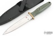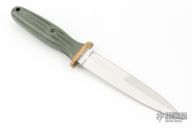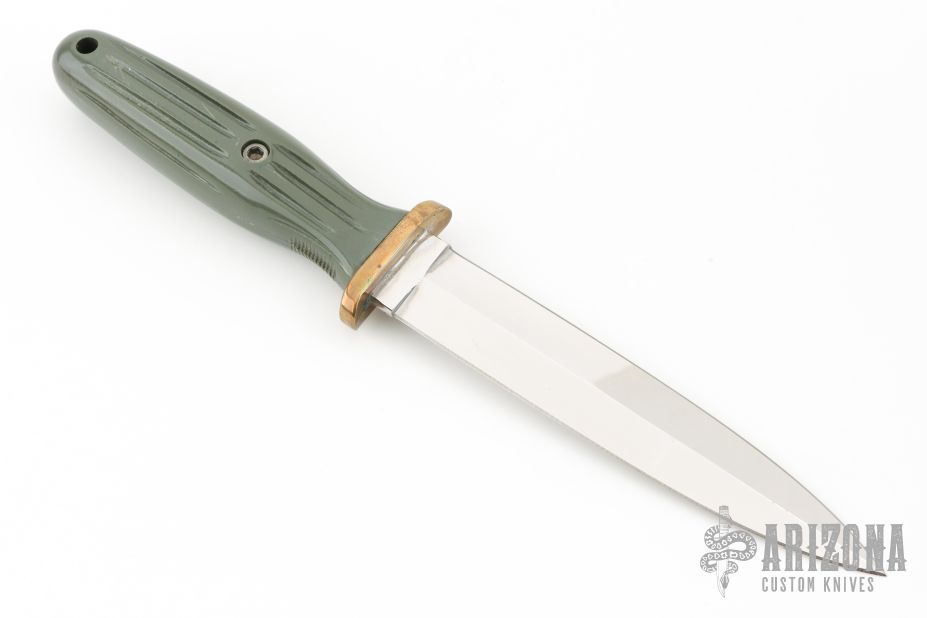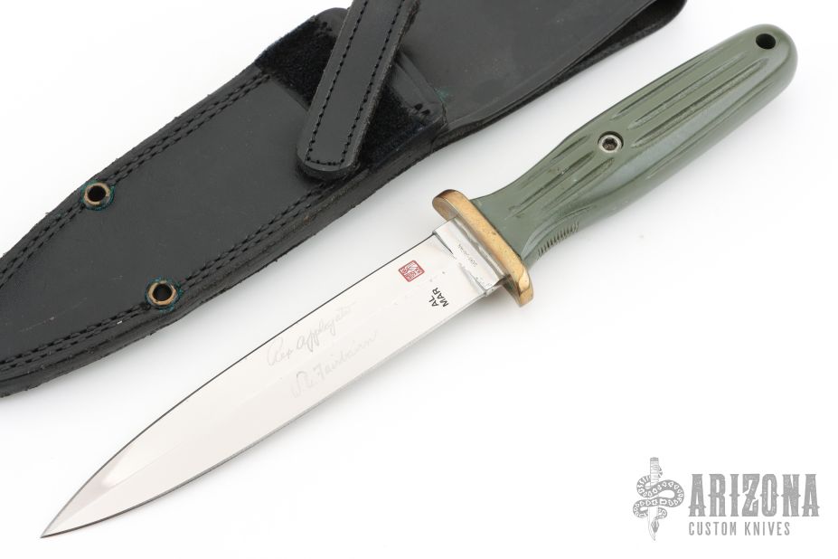This Applegate-Fairbairn Combat Dagger from Al Mar Knives has a mirror polished double edged blade, .184" blade stock and 1.104" blade depth, hidden tang construction. The handle has a brass double guard and green zytel handle. Lanyard Hole in pommel. Has some light scratches, otherwise excellent condition. Includes leather sheath with belt loop.