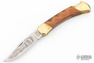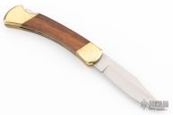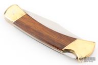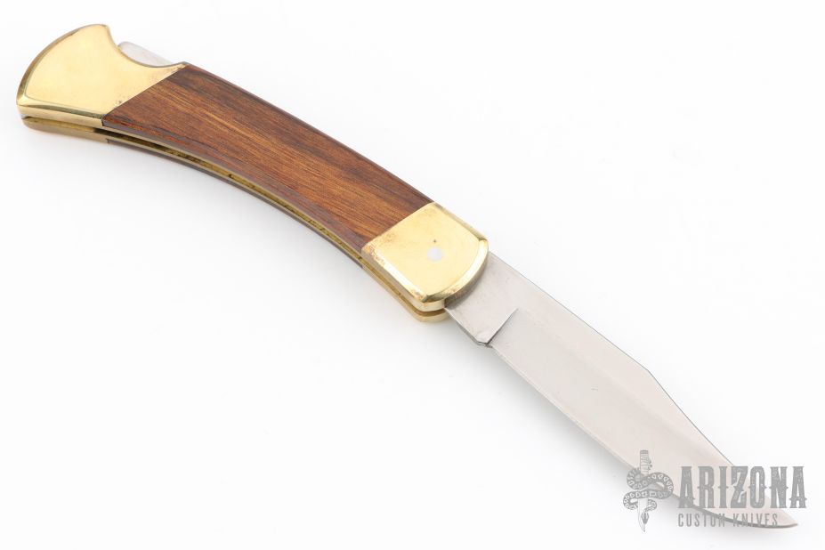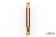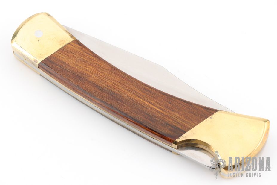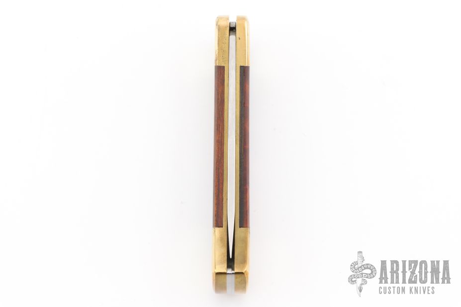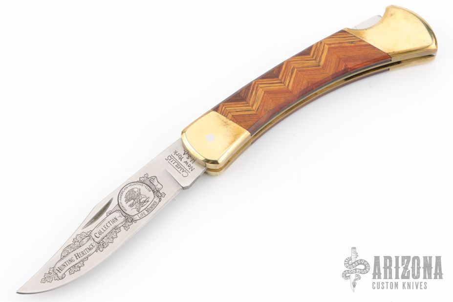 This lockback by Camillus features a satin finished blade with nail nick. The handle has brass bolsters with integral liners, mosaic wood covers, steel backspacer. Has a little patina, otherwise excellent condition.