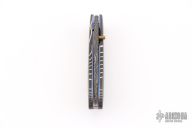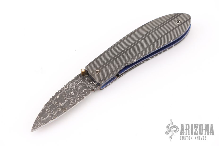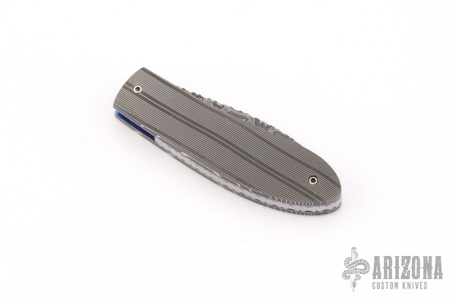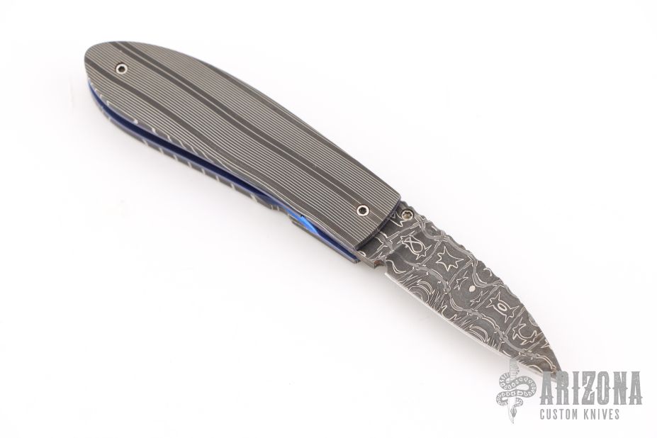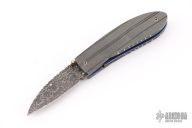 This linerlock folder by Arthur Washburn features a Mosaic Damascus blade with single thumbstud and file-worked blade spine. The handle has Damscus covers, anodized titanium liners and file-worked stainless backstrap. Nice detent, lockup and blade seating. Has some light scratches on the handle, great condition otherwise.