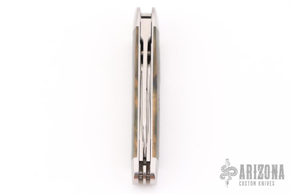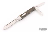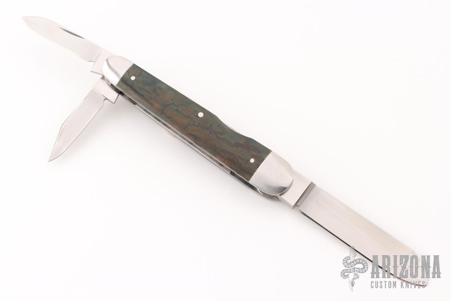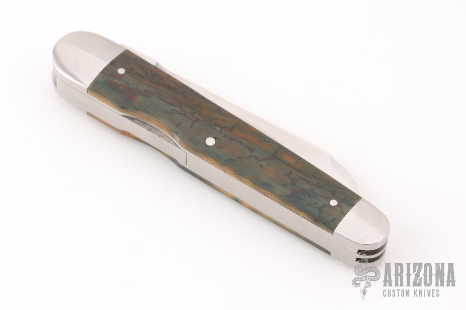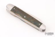 This Lockback Whittler from Luke Swenson features three hand rubbed satin finish blades with nail nicks. The large wharncliffe blade is a lockback and the two smaller blades are slipjoint blades with half-stops, flush in all positions. The handle has a stainless steel cap and bolsters with fossilized mammoth ivory bone covers and a stainless steel escutcheon over steel liners and springs. Comes in maker's zipper case. Excellent condition.