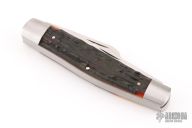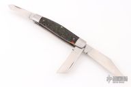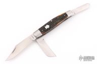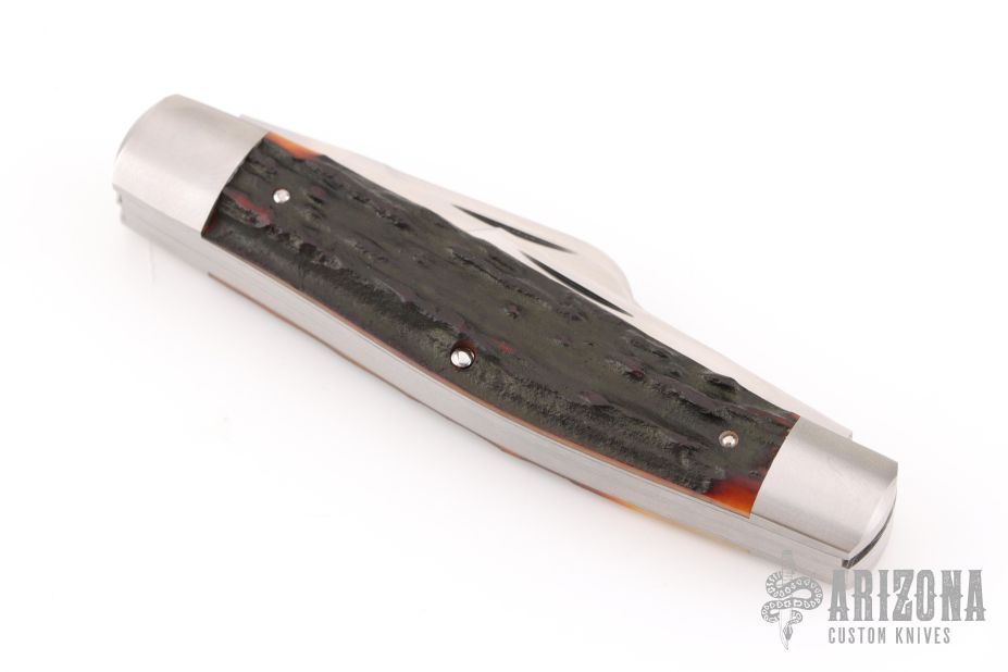 This Three-Blade Stockman by Tim Robertson features hand rub satin finished blades with nail nicks. The handle has pinched stainless steel bolsters, jigged bone covers with stainless steel escutcheon, stainless steel liners and springs. Half stop blade positioning on both blades, flush in all positions. Comes with maker's zippered case. Excellent Condition.