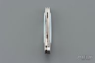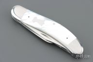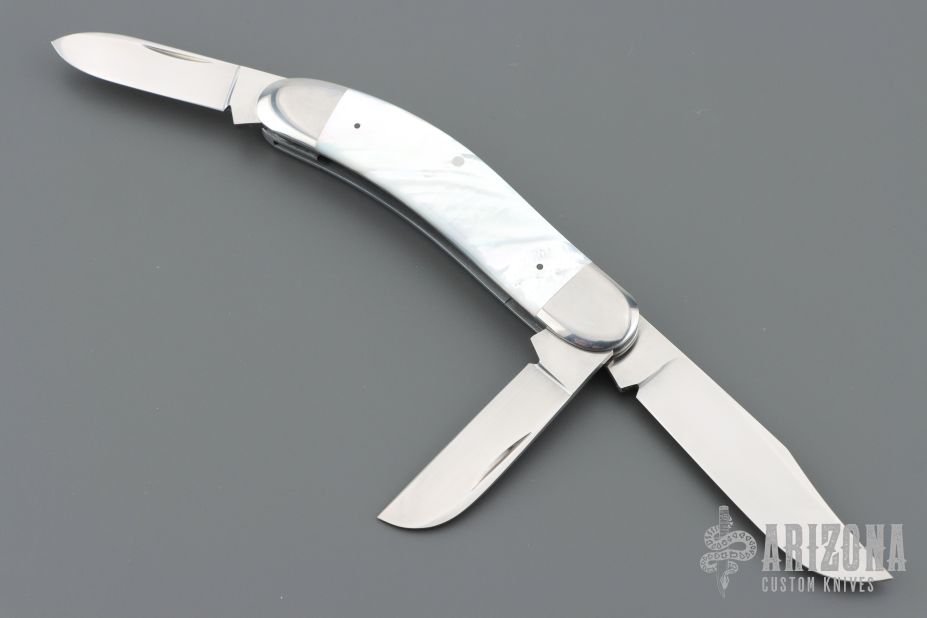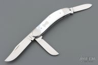 This 3-blade Sowbelly by Richard Rogers features hand rub satin finished blades with nail nicks. The handle has stainless steel bolsters and cap, stainless liners, and springs and pearl covers with a stainless steel escutcheon. Beautiful fit and finish. Comes with a zipper case. Has a couple light scratches, otherwise excellent condition.