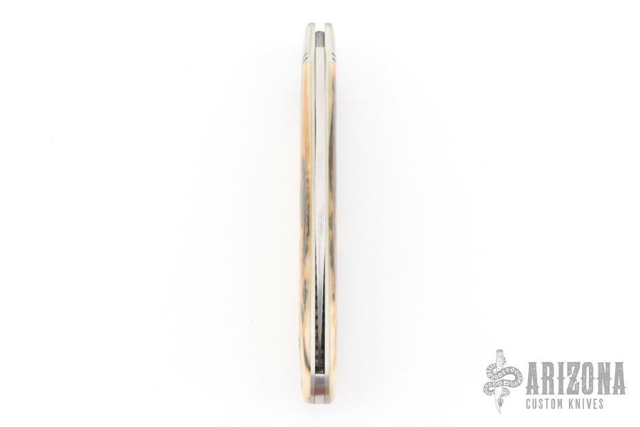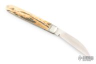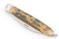 This Slipjoint by TA Davison features a hand rub satin finished wharncliffe blade with nail nick. The handle has pinched/fluted nickel silver bolsters, nickel silver liners, mammoth ivory covers with mosaic/silver pins, and stainless steel spring. Has half stop. Walk and talk leaves a little to be desired, the snap isn't crisp in open, half or closed. Excellent condition otherwise.