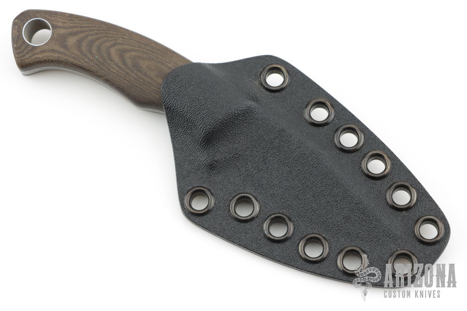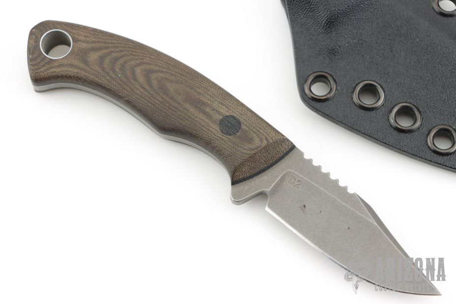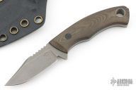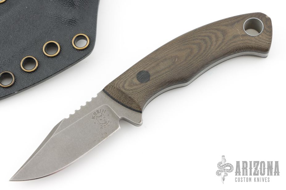 This Pocket Bowie by Tom Krein features a acid washed blade with notched thumbrest, .126" blade stock and .781" blade depth, full tang construction. The handle has green micarta scales with black liners and pins. Comes with 2 kydex sheaths. Has a couple of small spots on the b-side of the blade, otherwise excellent condition.