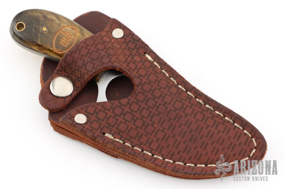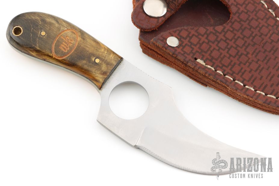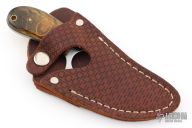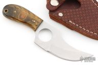 This knife has a satin finished blade with notched thumbrest, .163" blade stock and 1.708" blade depth, full tang construction. Has wood scales with brass pins and lanyard hole. Comes with a brown leather sheath. Has a couple light scratches, otherwise excellent condition.