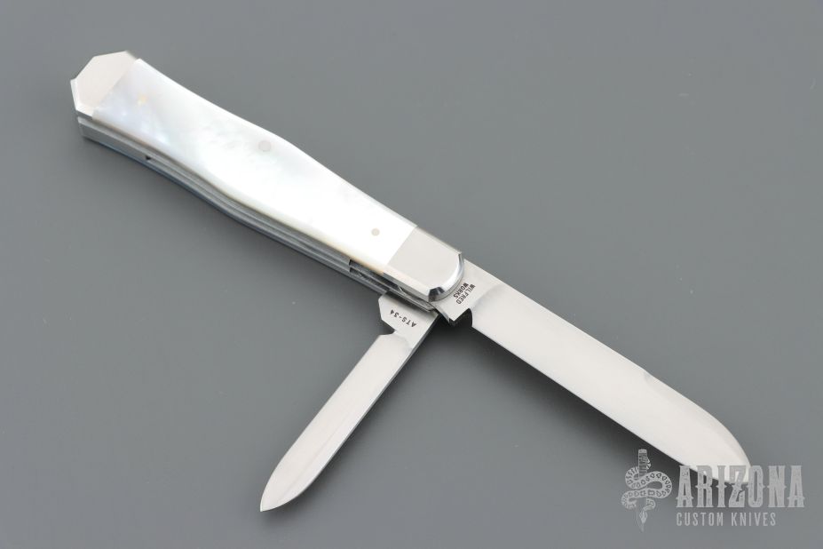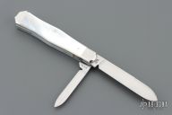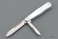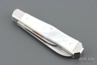 This Two-Blade Slipjoint by Reese Bose features hand-rubbed satin finish blades with nail nicks. The handle has stainless steel bolsters and liners, pearl covers with stainless steel springs. Has half-stops, flush in all positions. Excellent fit and finish. Comes with a zippered case. Excellent Condition.