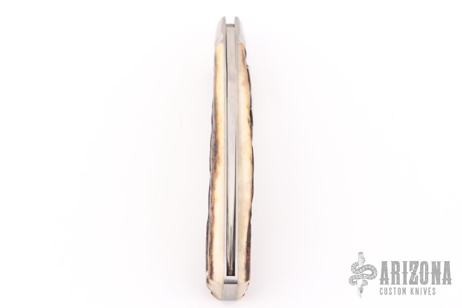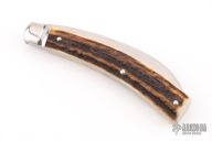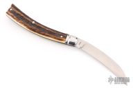 This Prunner by Tony Bose features a hand rub satin finished hawkbill blade with nail nick. The handle has fluted stainless steel bolsters, stag covers with stainless steel federal shield escutcheon, stainless steel liners and spring. Comes with a padded zippered case. Excellent condition.