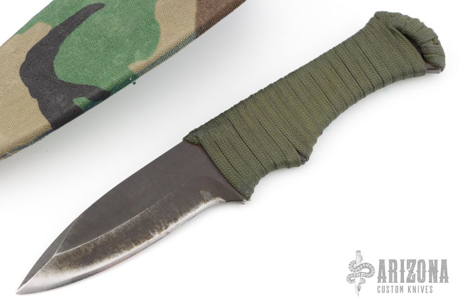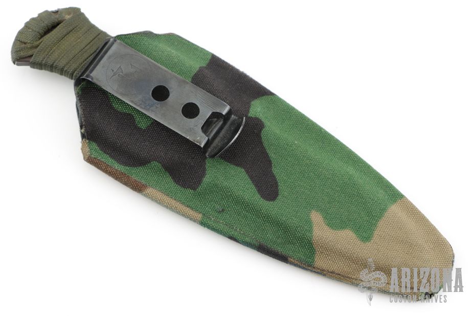 This Blood Shark by Tracker Dan features a black blade with .154" blade stock and .998" blade depth. The handle has flat paracord wrap. Comes with a camo covered kydex sheath and the knife will fit in either direction. And a black leather boot sheath. Has some scratches, has been used, otherwise good condition.