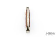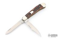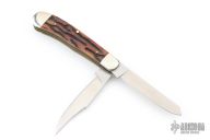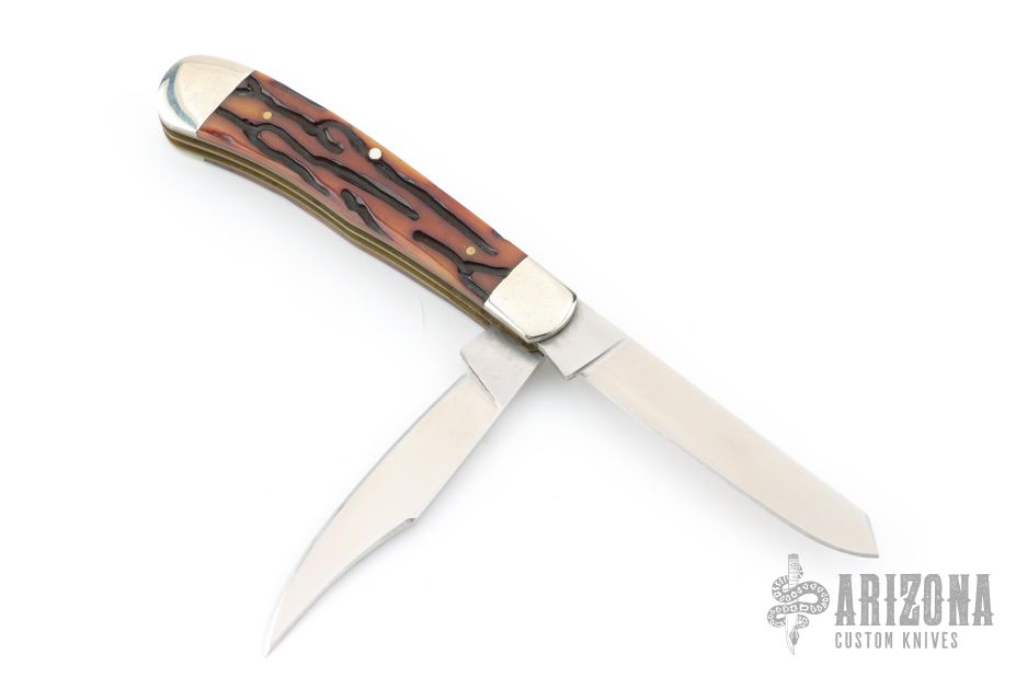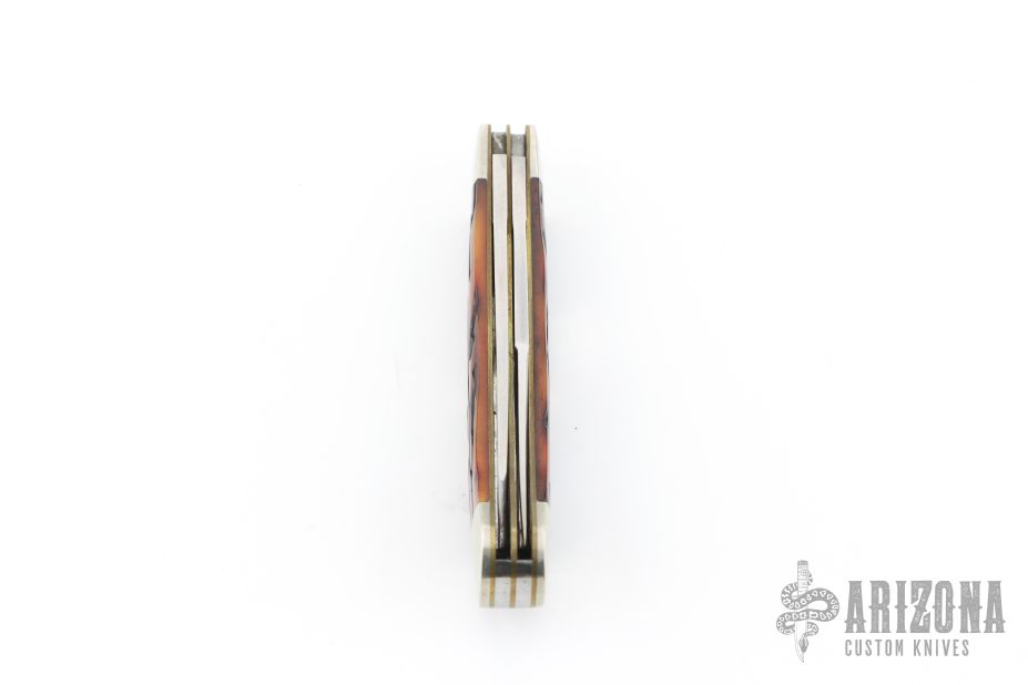 This knife by Ken Erickson features two satin finished blades with nail nicks. The handle has nickel silver bolsters, groove bone covers, brass liners and steel springs. Has half-stops, almost flush in all positions. Comes with a zippered case. Has a nick in the blade edge and appears resharpened. Has a couple light scuffs, otherwise Excellent condition.