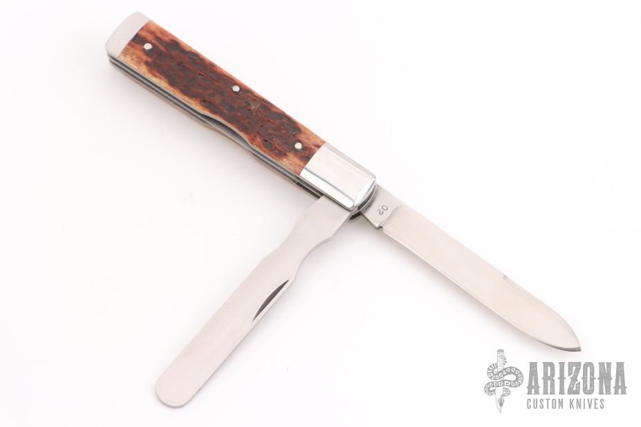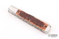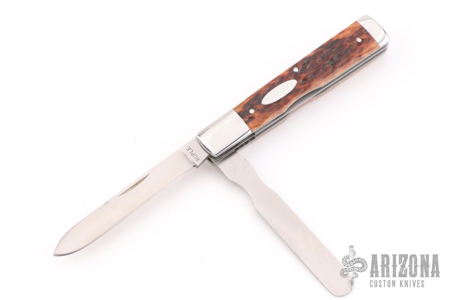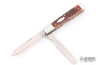 This Doctor's knife by Bill Ruple features a hand rub satin finished blade with nail nick and a satin finished spatula blade with nail nick. The handle has stainless bolster, stainless cap, red jigged bone covers with a stainless oval escutcheon, stainless liners with fileworked spines, stainless springs. Blades have half stops and are flush at all positions. Comes with a leather pouch. Has a few very light scratches and scuffs, excellent condition.