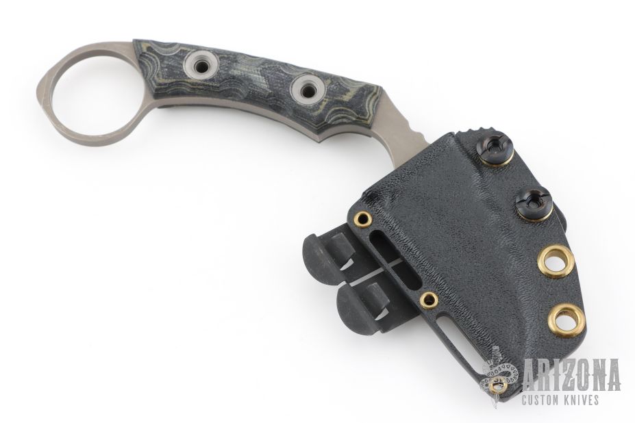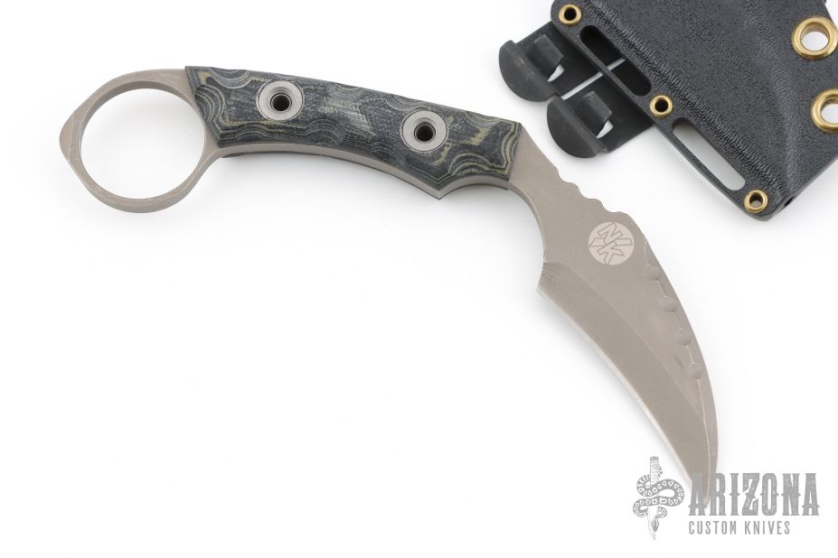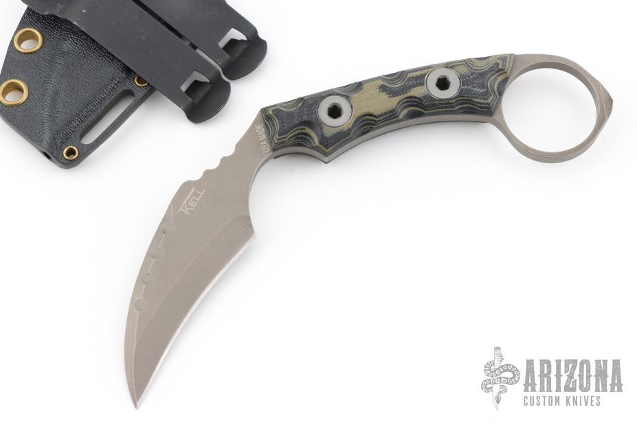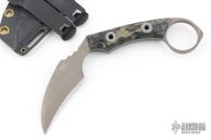 This FLN by Tim Kell and Neeve Knives features a stonewashed blade with notched thumbrest, .171" blade stock and .994" blade depth, full tang construction. The handle has green/black G-10 scales. Comes with a Kydex sheath. Has a couple light scuffs, otherwise excellent condition.