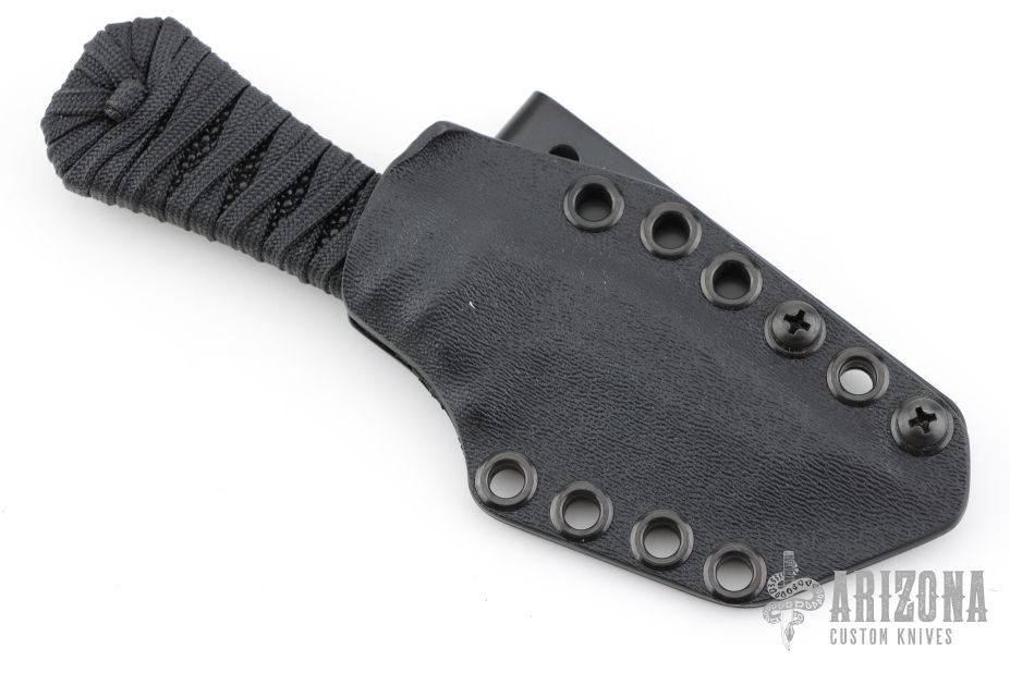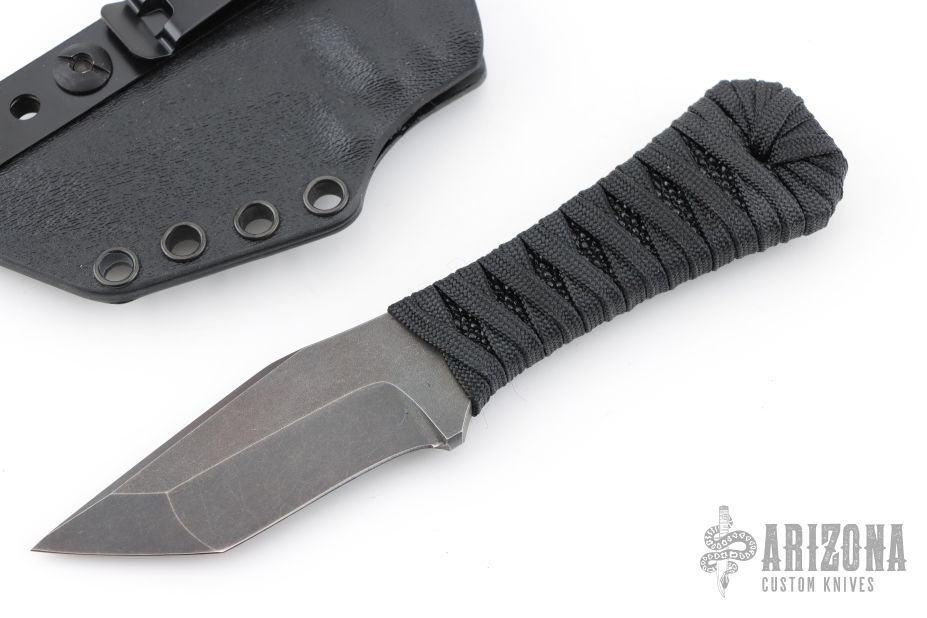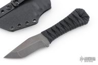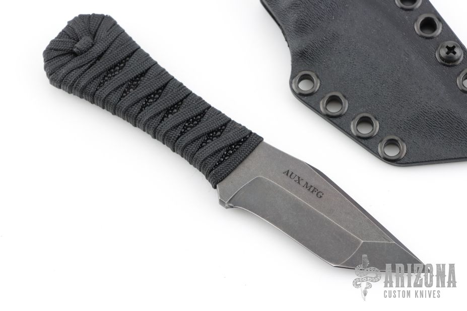 This Coffin Tanto by Auxiliary Manufacturing features an acid tumbled blade, .197" blade stock and 1.002" blade depth. The handle has black cord wrap over stingray skin. Comes with a kydex sheath with clip, original box and COA. Excellent condition.