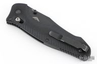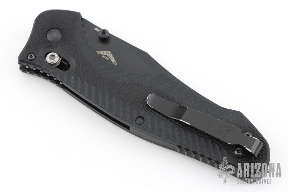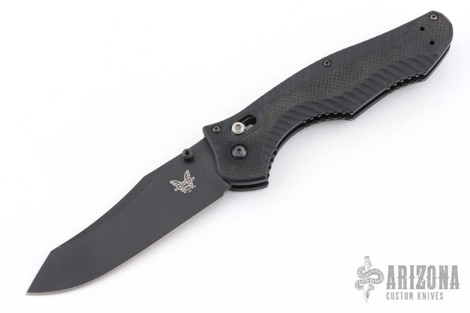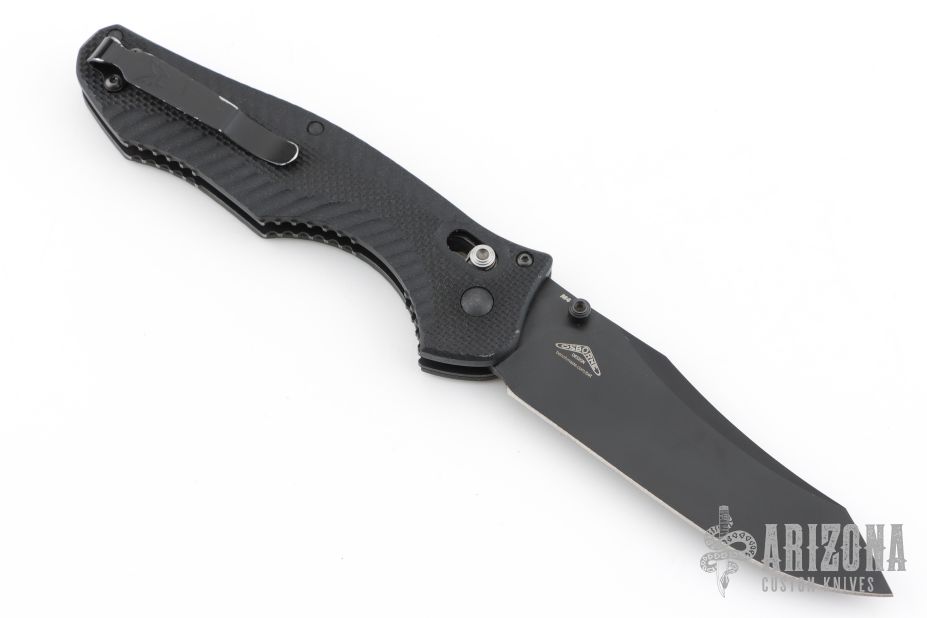 This Contego from Benchmade features a black blade. Black G-10 handle textured in the center and grooved on edges for a better grip. Carbide glass breaker on pommel. Perfect function and strong lock up. Comes with original box. Has a couple scuffs and some wear on the clip, otherwise good condition.