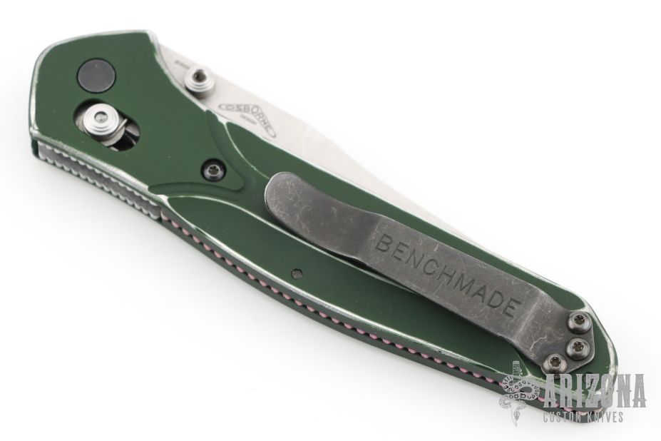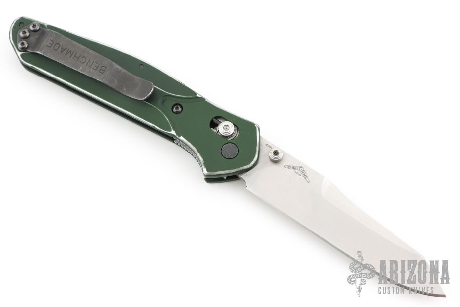 This Benchmade Osborne 940 features a tumble finished clip point blade with swedge and dual thumb studs. The handle is comprised of a machined and green anodized aluminum frame over jimped and purple anodized titanium backspacer. The black coated, steel tip up clip is reversible for right or left hand carry. Has some wear on the edges of the frame, otherwise good condition.