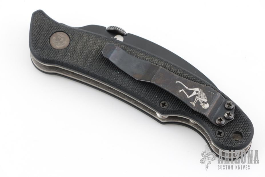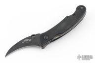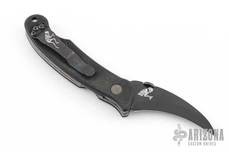 This Elvia by Emerson Knives features a black hawkbill blade with thumbdisc. The handle has black G-10 scales, titanium liners and a black stainless steel tip up clip. Comes with an Emerson box and papers. Comes with Emerson skull bead lanyard and two extra black steel clips. Excellent condition. #0918
