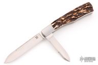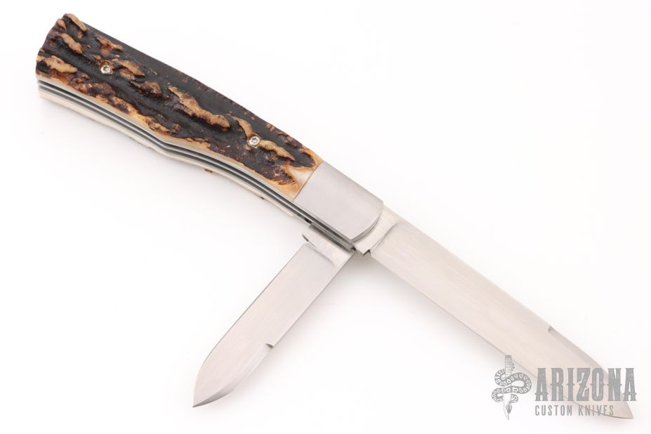 This Gunstock by Bailey Bradshaw features hand rub satin finished blades with long pulls. The handle has integral stainless bolsters/liners, stag covers and stainless steel springs. Comes in a Bill's case. Has some light  scratches, otherwise excellent condition.