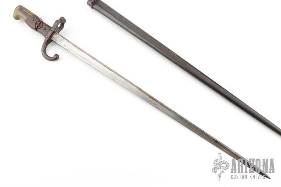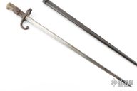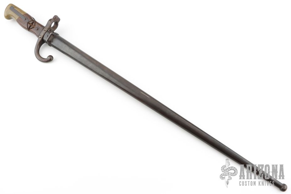 Standard Gras pattern complete with functional spring lock. 20 ⅝” T back blade marked Mre d’ Armes de St Etienne Feirier 1879. Stamps on blade are "M" inside a circle and some other hallmarks as well. The guard has some stamps, but it has oxidation so you can't make them out. The handle has two-piece wood scales with brass butt and functional spring lock. Comes with original scabbard stamped "P 5514". Has scratches and oxidation. Good condition for a nearly 150 year old item. This is a French M1874 T-Back sword bayonet for use on the 11mm M1874 Gras Rifle.