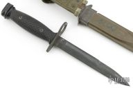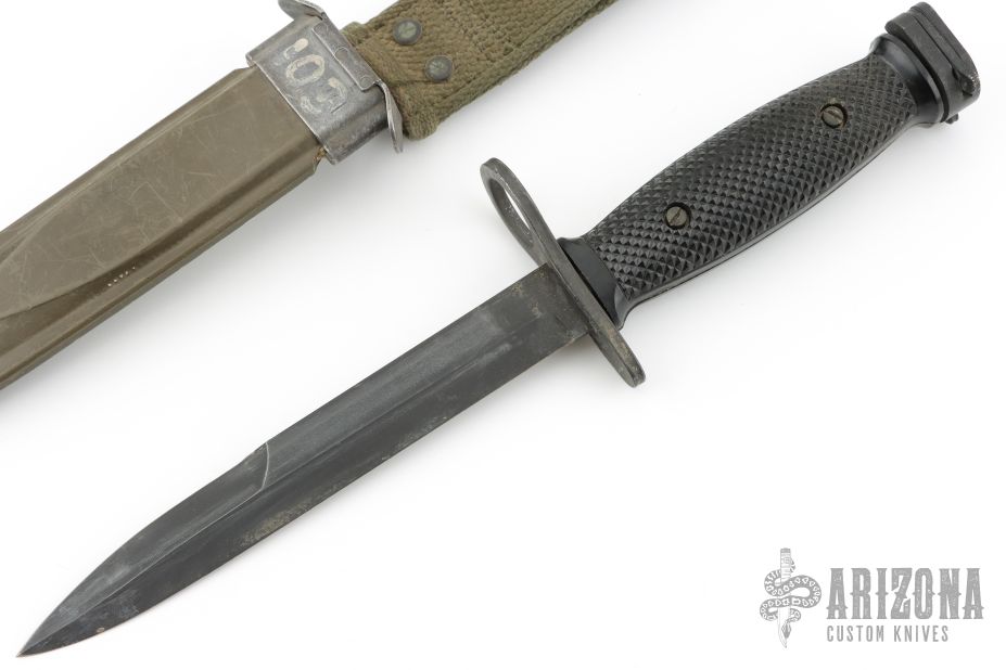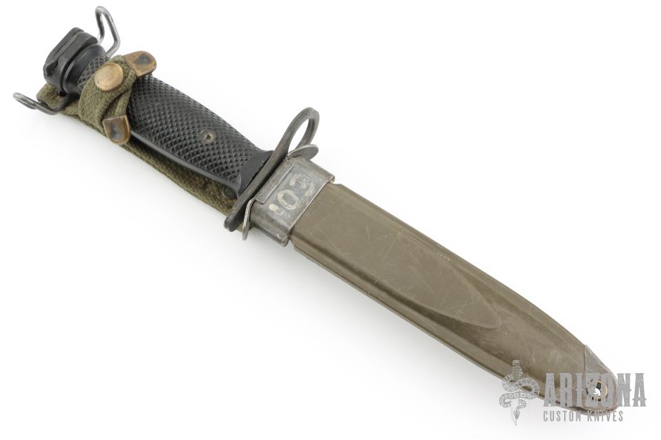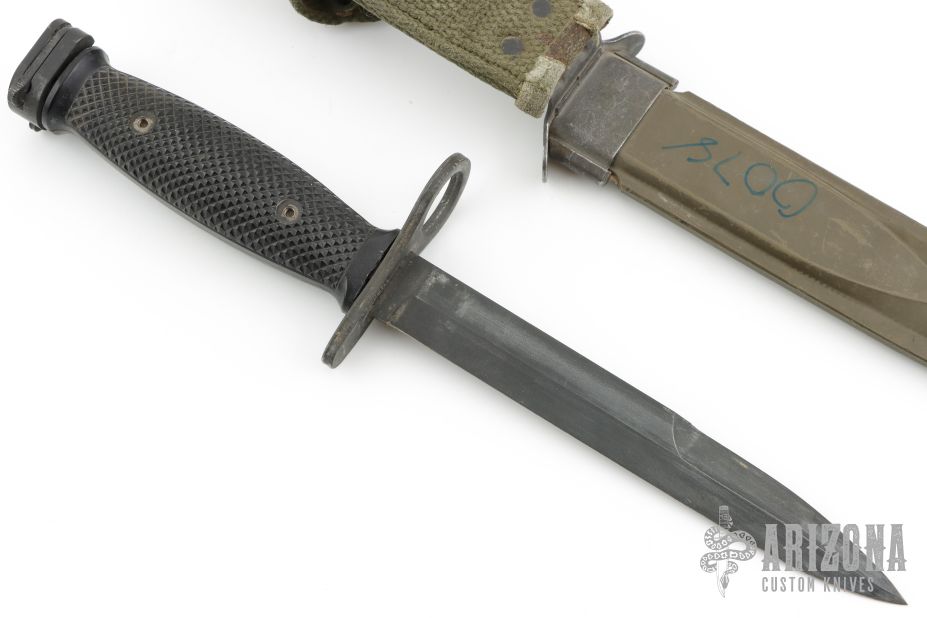 This M8A1 has a black bayonet style blade with sharpened top edge, .189" blade stock and .860" blade depth, hidden tang construction. The handle has a black steel guard and checkered handle. Comes with original sheath. Has scuffs and scratches, good condition for its age. This is for an M16 rifle.