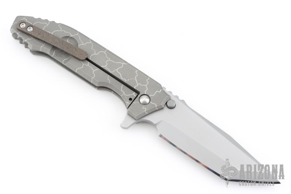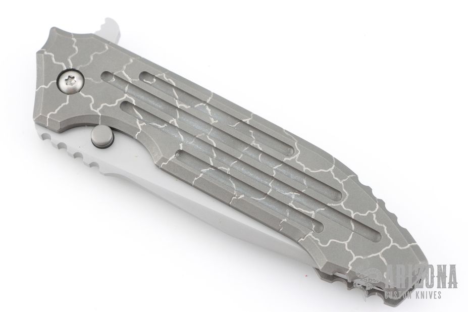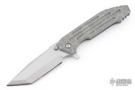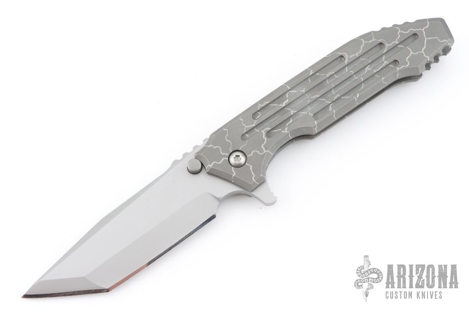 This Snafu Integral Framelock Flipper from Peter Rassenti has a bead blasted tanto blade with dual thumb studs, flipper and notched thumbrest. Handle is a single monolithic slab of .50" titanium, with desert floor patterning, lanyard tube at butt and timascus tip up clip. Includes original box. Has a couple light scuffs, otherwise excellent condition.