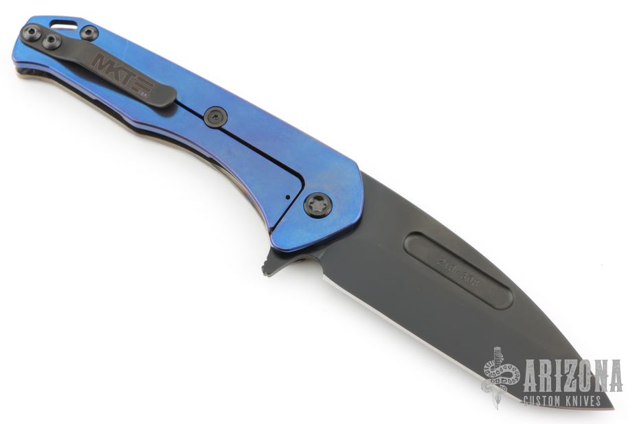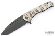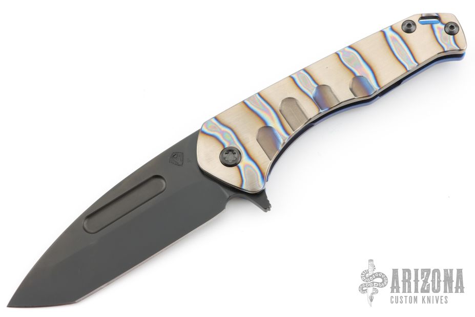 This Praetorian Slim by Medford Knife and Tool features a black PVD coated blade with a notched flipper tab.  The handle features a flamed and anodized titanium frame with a matching tip up pocket clip.  Includes the original box and papers.  Excellent Condition.