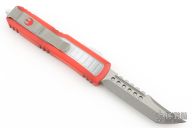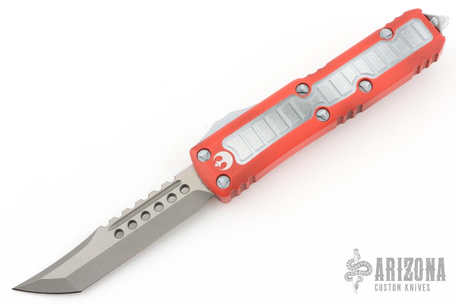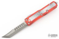This UTX-85 by Microtech features a stonewashed tanto blade with satin flats and fullers. The handle has a red/white aluminum frame with matching hardware and tip down clip. S/N 081 and dated 11/2023. Comes with original box and papers. Excellent condition.