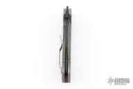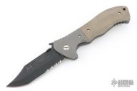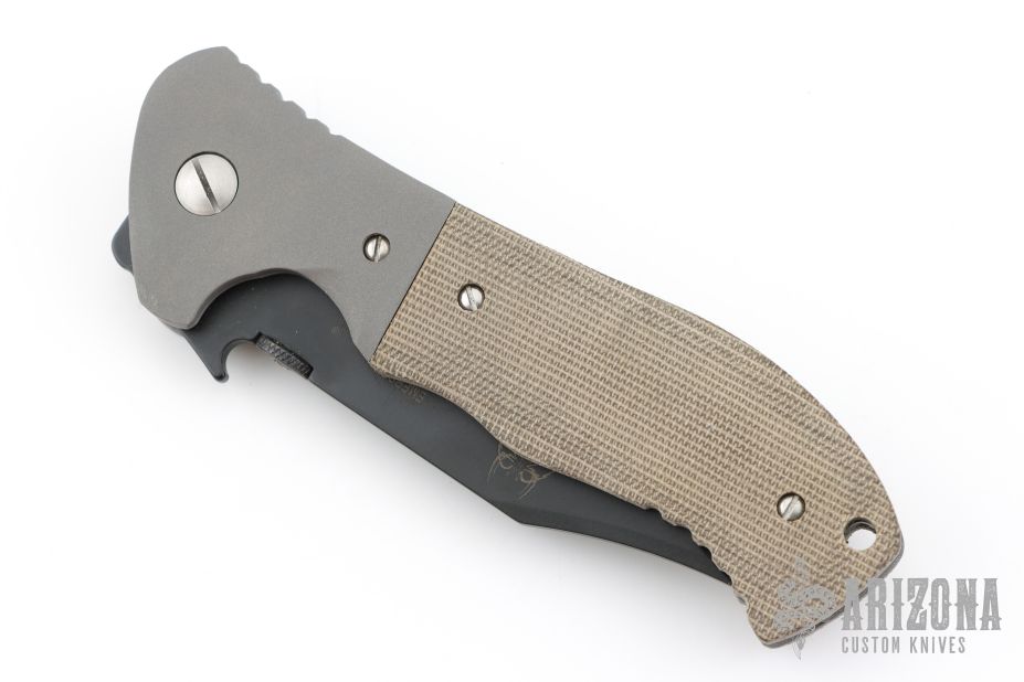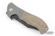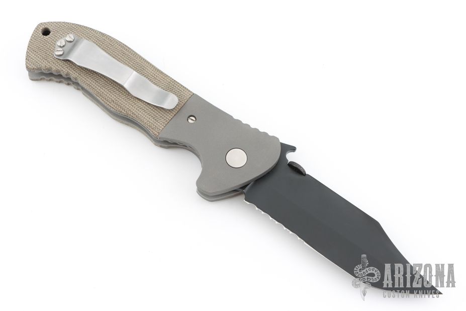 This Po-Boy Emerson CQC-22 by Andrew Charlet features a black partially blade with notched thumbrest, wave feature and thumbdisc. The handle has dovetailed and bead blasted titanium bolsters, green canvas micarta scales, bead blasted titanium liners, black G-10 backspacer, tip up stainless steel clip. Comes with original box. Has a couple light scuffs, otherwise excellent condition.