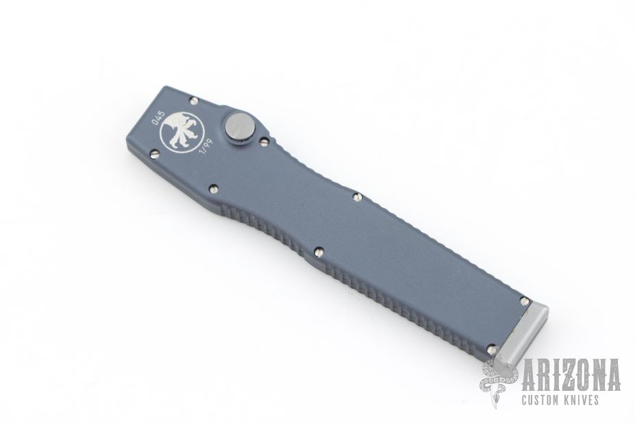 The Microtech Mini-Halo is a rare gem from Microtech's past. This knife was made in 1/1999 and was very limited in production, this one is #045. The size of the knife is tiny, fully opened, the knife fits in the palm of your hand. Features a Damascus blade, grey aluminum frame and a bead blasted stainless steel charging handle. Super Rare. Excellent condition. Comes with original wooden box.