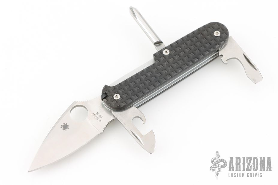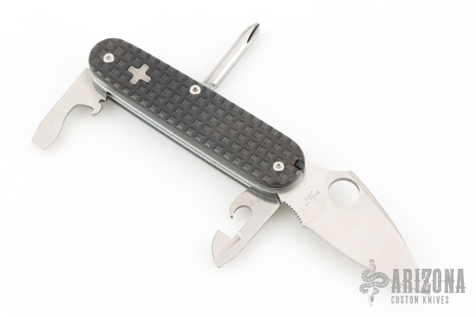 This Victorinox has been modified and has a Spyderco blade, which is a lockback. It features satin finished tools, and black titanium frag handle scales. Four tools total.  Excellent condition.  Comes with a zippered case.