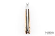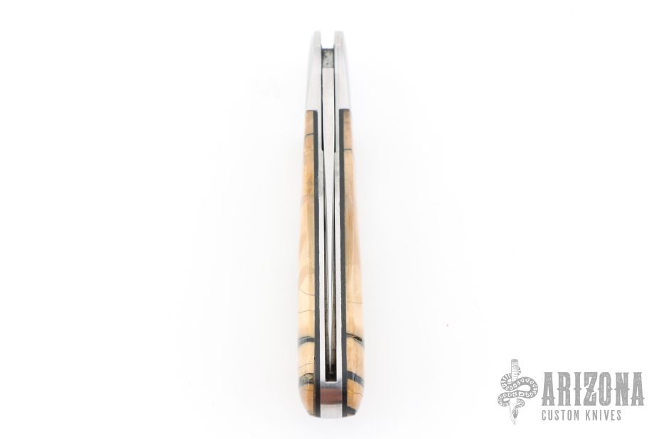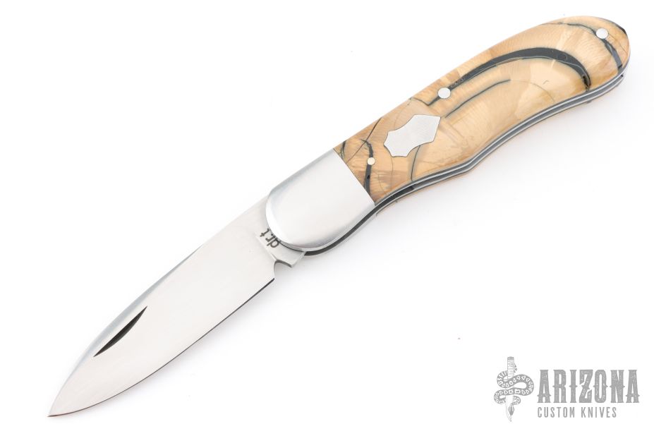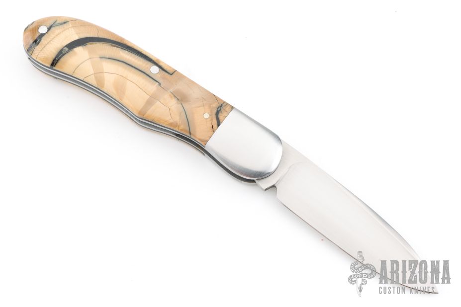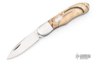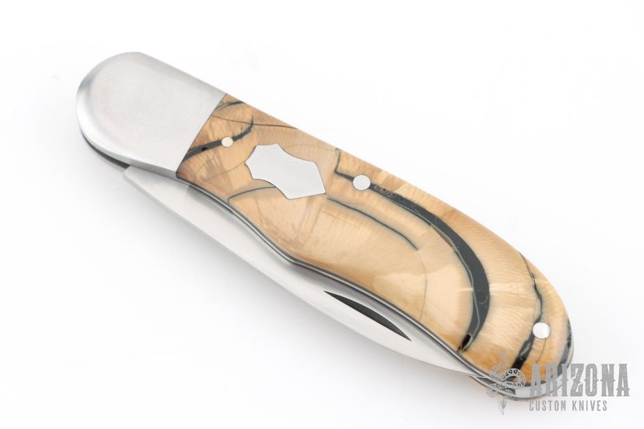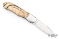 This Hawk Falls Trapper by David Taber features a hand rub satin finished blade with nail nick. The handle has stainless steel bolsters and liners, crosscut mammoth ivory covers with black liners, stainless steel escutcheon, stainless steel spring. Half-stop, flush in all positions. Comes with COA and zippered case. Excellent condition.