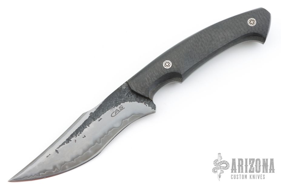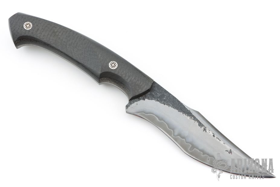 This Viper from the Sobral Brothers features their San Mai steel that has been forged into a beautiful finished product. Has a clip point recurve blade with a false top edge, .164" blade stock and 1.204" blade depth, full tapered tang construction. The handle features carbon fiber scales with black canvas micarta liners, stainless steel pins that have been laser engraved. Comes with a hand tooled black leather sheath. Excellent condition.