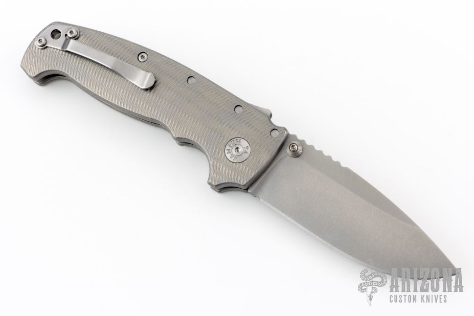 This AD20 XL by Andrew Demko features a tumble finished blade with notched thumbrest and dual thumbstuds.  The handle has a textured/bead blast finished titanium frame with a tip up titanium clip and "Shark" lock release on the spine. Nice action and lockup. Comes with original box and zippered case. MagnaCut Blade. Excellent condition.