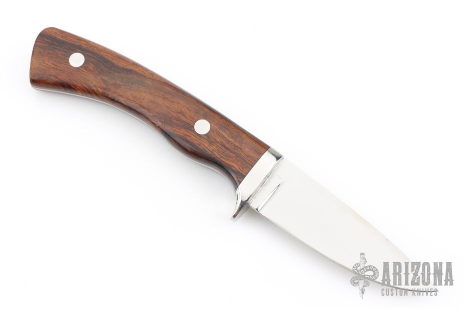 "I have been a knife maker since 1983. I got my start watching George Herron in his shop. He has always been a mentor, answering all of my questions and helping with the little problems of knifemaking. Most of my work is geared toward hunters. Since the most important part of the hunt is not the gun, no matter how much it costs, but a knife that will get the job done comfortably and quickly. I also build a few boots and fighters. All blades are ATS-34 that are professionally heat-treated to a Rockwell 59. All guards, bolsters, and pins are 303 Stainless. All knives are serial numbered. The sheaths are pouch type and are wet-formed to fit each knife."
