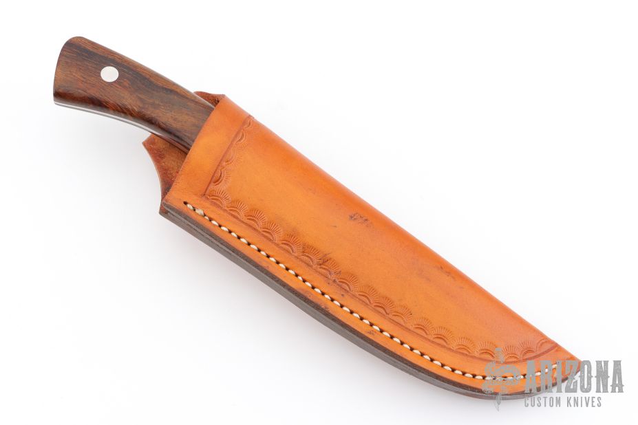 This Hunter from Larry Page features a mirror polished drop point blade, .124" blade stock and .950" blade depth, full tapered tang. The handle has a polished stainless steel guard, desert ironwood scales over red liners. Marked #5577 on the underside of the tang and on the back of the sheath. Comes with a brown leather belt sheath. Excellent condition.