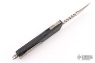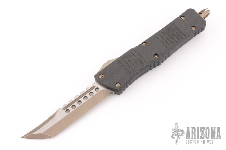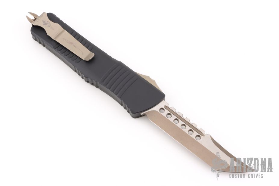This Combat Troodon by Microtech Knives features a bronzed Hellhound blade with satin flats. The handle has a carbon fiber and aluminum frame with tip down bronzed stainless steel clip and hardware. Comes with original box and papers. 11/2017 and s/n 073. Excellent condition.