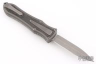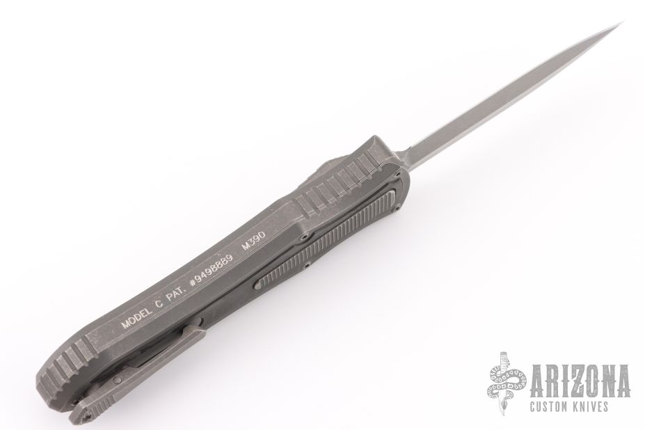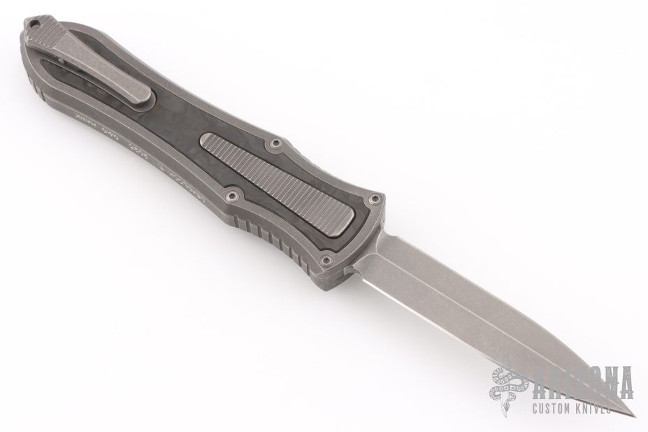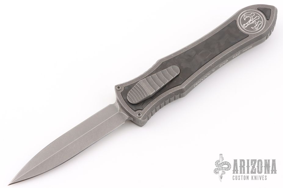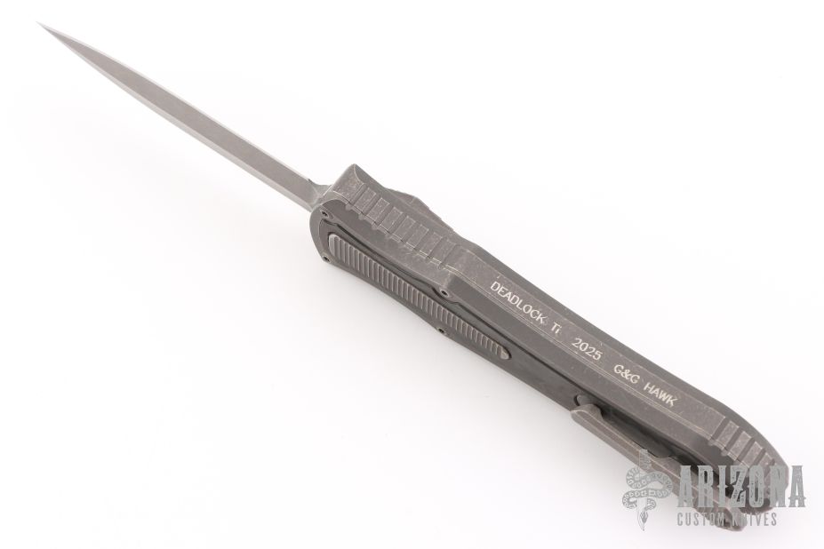 This knife is a Deadlock Model C by Grant and Gavin Hawk. It has a double-edged blade. The handle has a Fat Carbon inlays in the stonewashed titanium frame with a tip down spring clip, titanium. The thumb slide on the handle is also DLC titanium and handle has a DLC titanium overlay. Comes with original zippered case, tool and card. Grant and Gavin Hawk set out to create a double action OTF with no blade play.... They did it, NO blade play. Excellent condition. Comes with zippered case and tool.