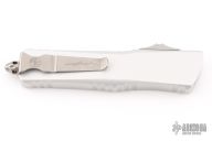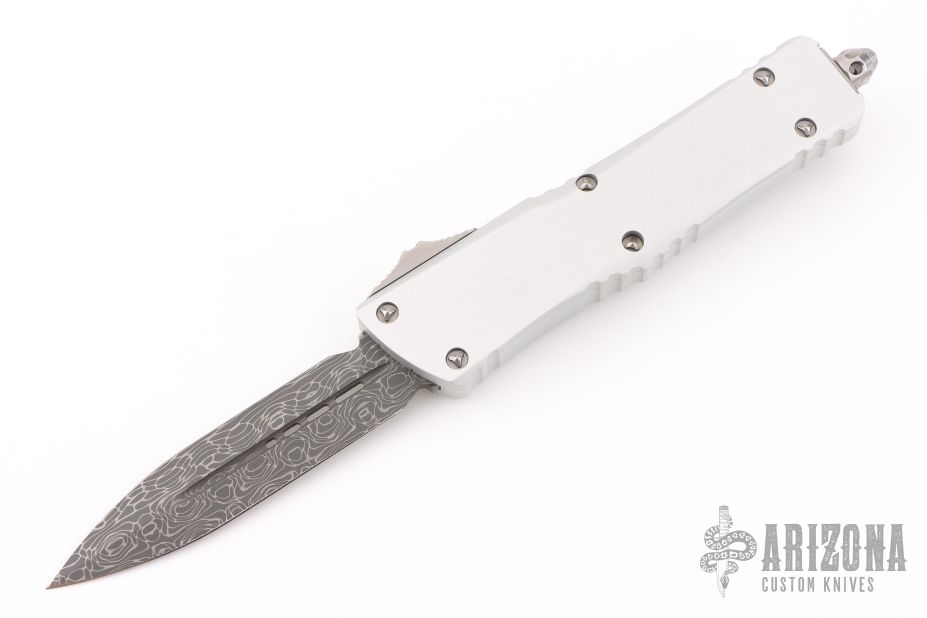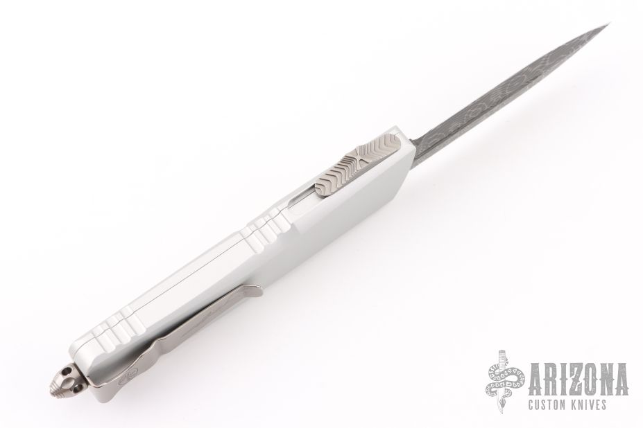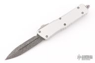 This Combat Troodon OTF automatic features a D/E Damascus blade with one fullers. The handle is composed of a clear finished aluminum frame. Stainless steel clip. Glass breaker. Excellent condition. Comes with original box and papers.